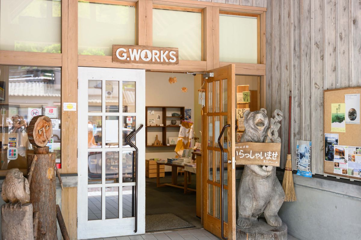 「つぐみ食堂」と「龍游館」がある建物の隣には、手工芸のぬくもりに癒やされる「G.WORKS」が。地元の紀州材を主に使用した家具や木彫り製品が並ぶ温かいお店です。