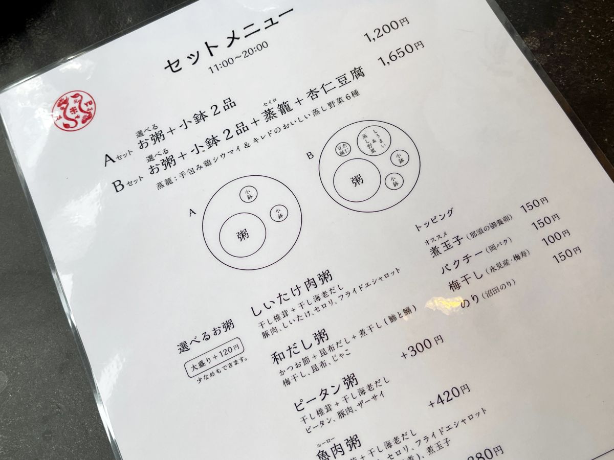 メニューはお粥に小鉢2品が付くAセット1200円〜、お粥と小鉢2品に蒸籠と杏仁豆腐が付くBセット1650円〜の2種類。選ぶお粥によって値段が変わります。