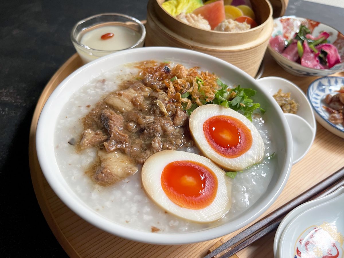 「魯肉(ルーロー)粥」はセットの蒸籠蒸し野菜とともにヘルシーに