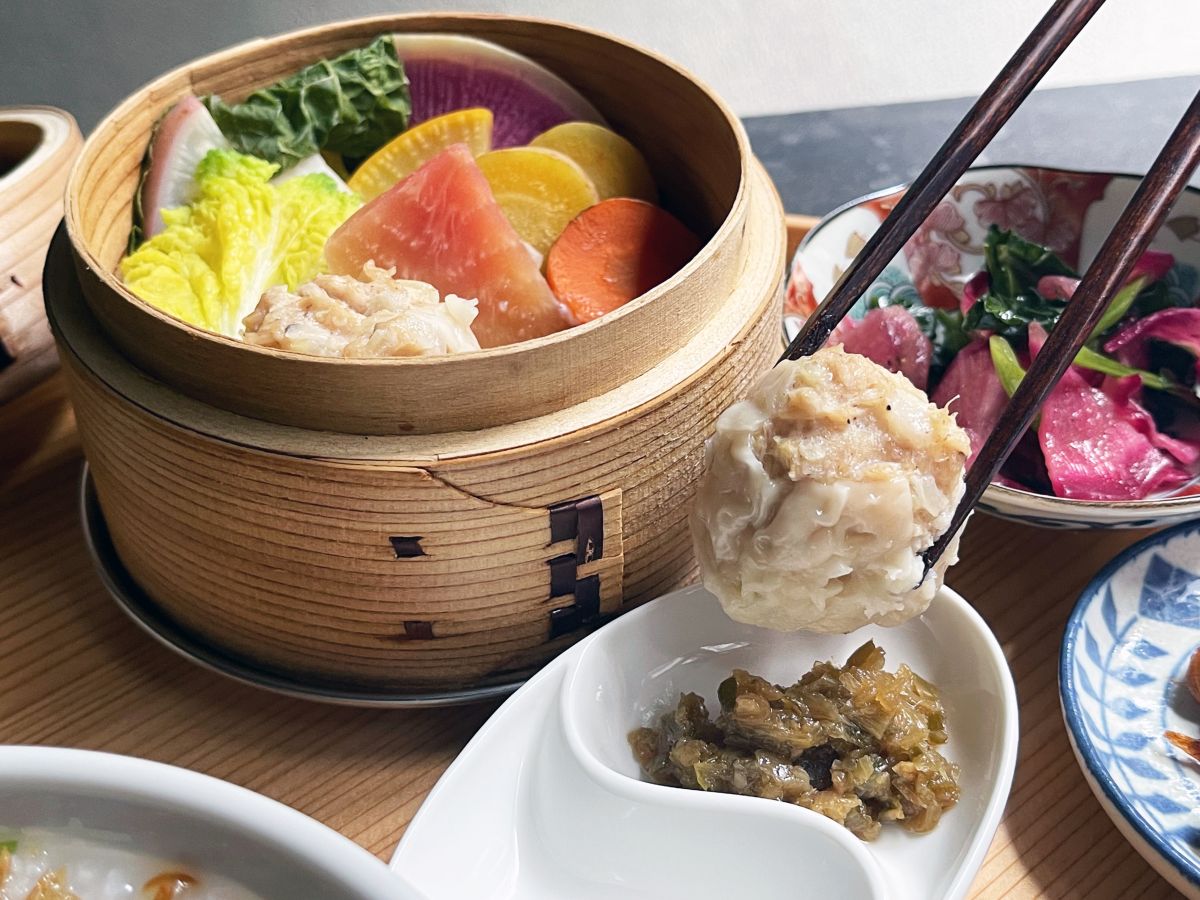 蒸籠には「手包み鶏シウマイ」2個と、千葉の農家「キレドベジタブルアトリエ」から取り寄せた季節の蒸し野菜が6種類ほど。