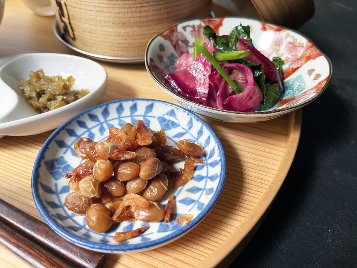 取材日(※2024年5月)は、大豆と干しサクラエビで炊いた「エビ豆」と、「スティックセニョール(スティックタイプのブロッコリー)と赤ダイコンのマリネ」でした。山椒オイルがピリッと利いていて、歯ごたえと酸味も絶妙。「エビ豆」はお粥にトッピングし、味変もできてお得な気分に。