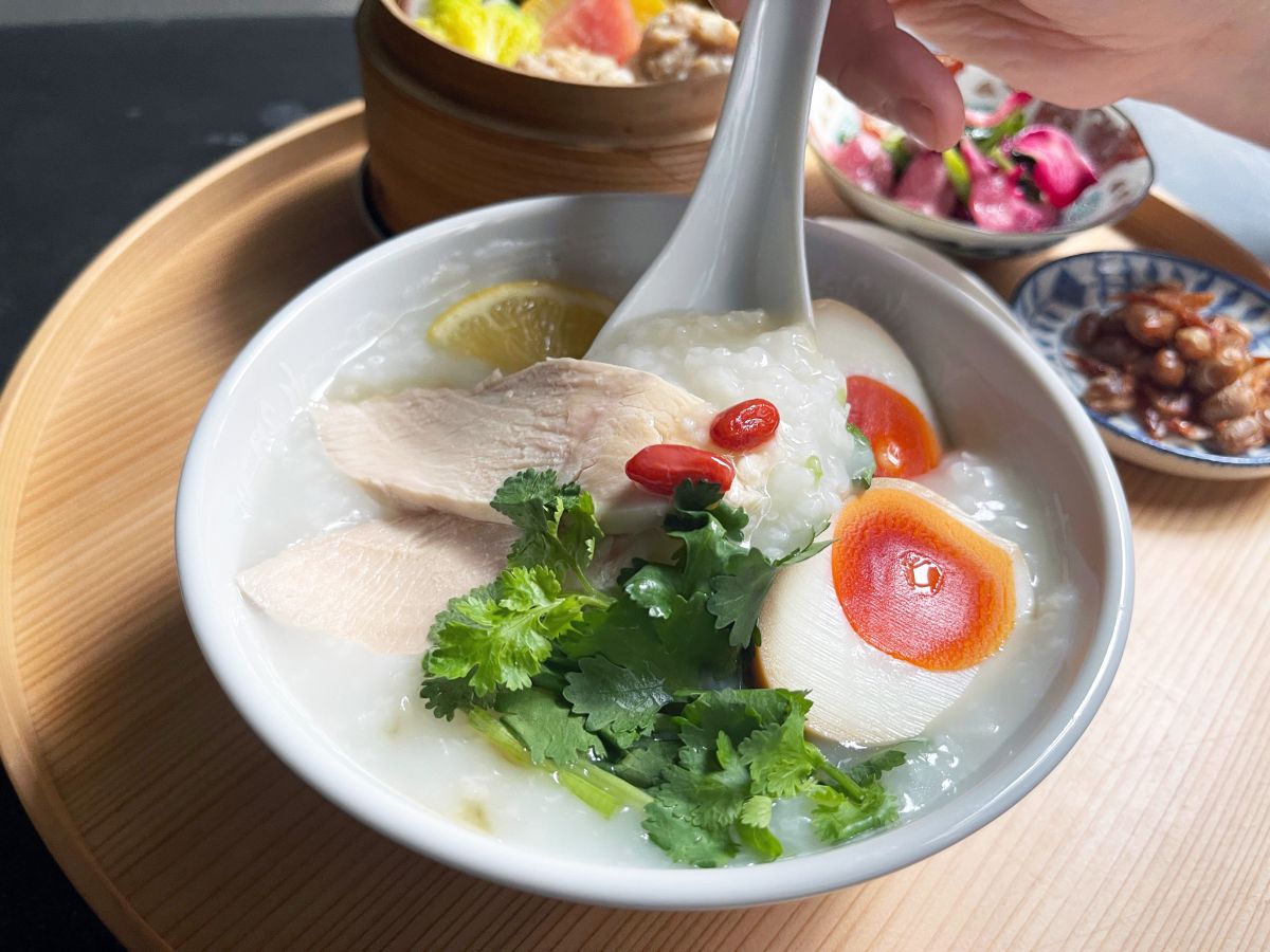 「鶏レモン粥」は、鶏だしと昆布だしで炊いた粥。レモングラスも香ります。パクチーと隠し味のナンプラーが利いていて、まるでベトナムのフォーのような味わい。クコの実もいいアクセントになっています。