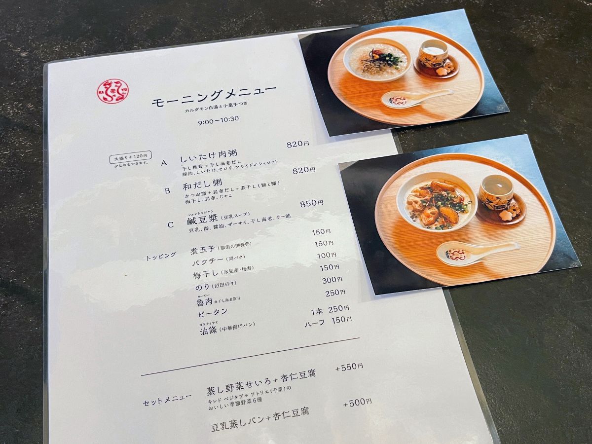 また、お粥といえば朝ごはんを思い浮かべる人も多いのでは。「粥や佐藤」は朝の9時からオープンしているので、モーニングメニューも人気だそう。台湾式豆乳スープの「鹹豆漿(シェントウジャン)」850円など、朝しかないメニューも用意されています。(※モーニングメニューの提供は9時~10時30分)