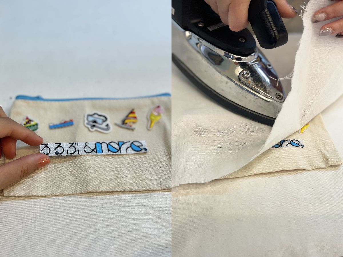 ワッペンの位置を確認して、アイロンで仮止めします。ここもスタッフさんがていねいに作業してくれます。