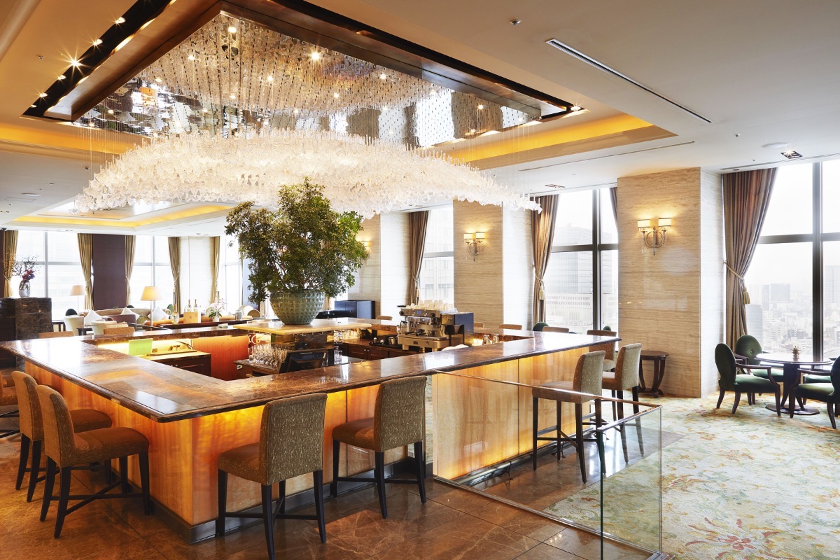 アフタヌーンティーが楽しめる「ザ ・ロビーラウンジ」は28階にあります。東京都の木・イチョウの葉をモチーフにしたクリスタルガラスのシャンデリアが輝く豪華なバーカウンターを中心に、英国アンティーク調のテーブルセットが並び、非日常の華やかさと、しっとりとした落ち着きが共存しています。