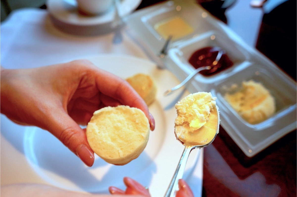 イギリスではスコーンを食べる時に欠かせないクロテッドクリームももちろん用意されています。脂肪分がバターと生クリームの中間というクロテッドクリームは、その味わいもバターと生クリームのいいとこどり。
