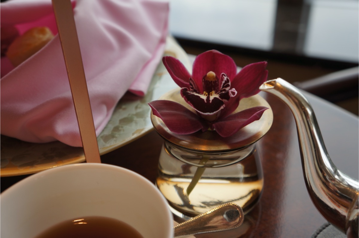 卓上に飾られたランの花。シャングリ・ラ 東京には館内のさまざまな場所に上品なランの花が飾られていて、アジアンリゾートの一面を感じさせてくれます。ヨーロッパの上流階級の人々によって培われてきたあらゆる面での質のよさを享受しながら、ここでしか味わえないアフタヌーンティーを堪能しましょう。