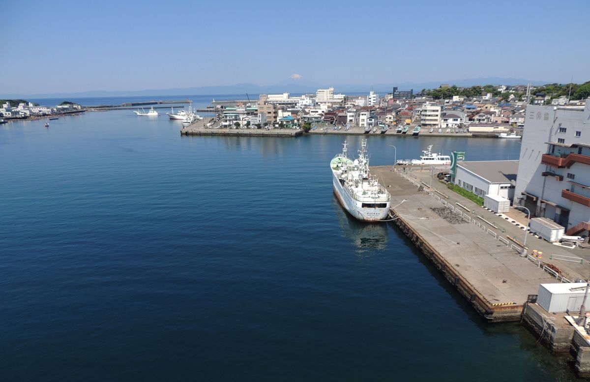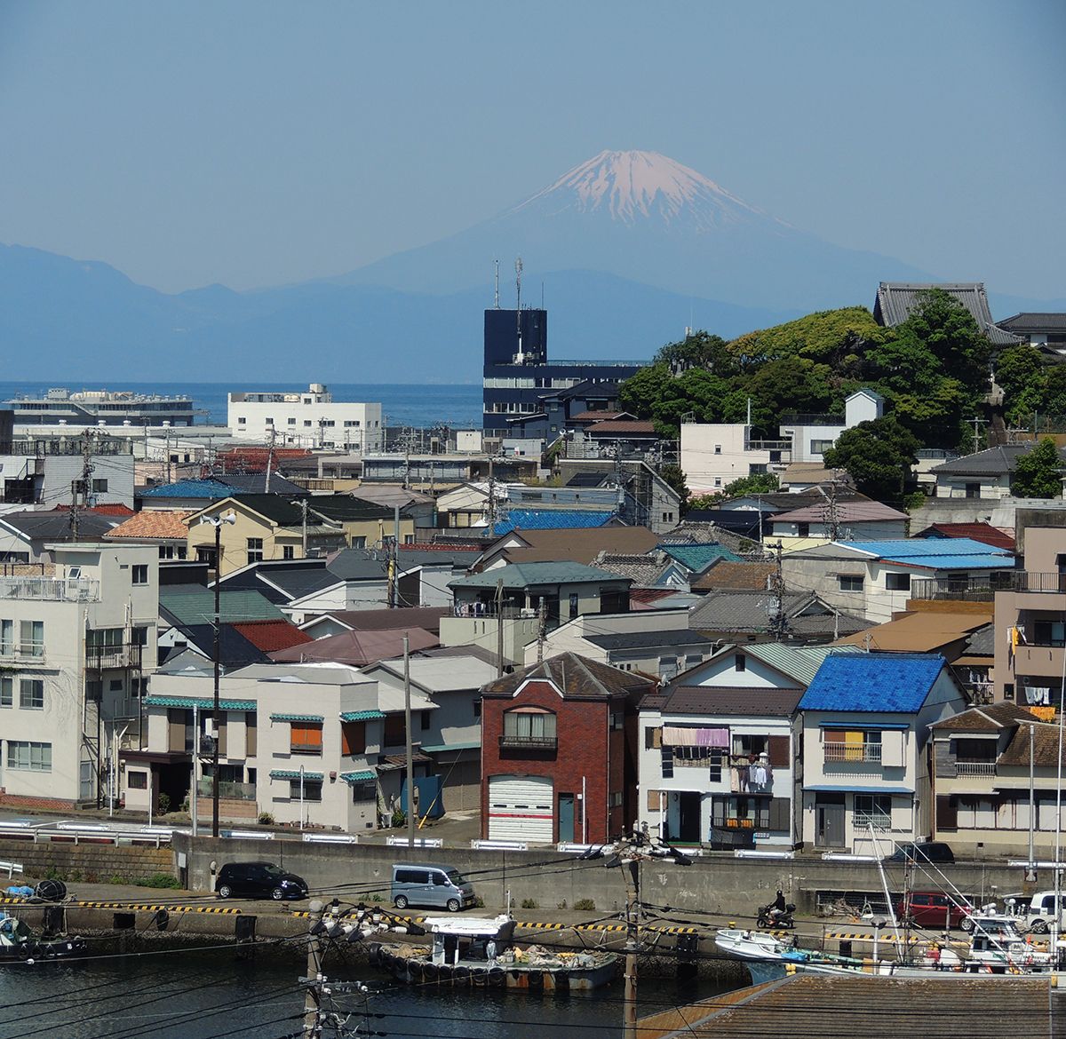 城ケ島大橋から見た三崎の港町、海南神社、そして遠くの富士山のコントラストがいいですね!