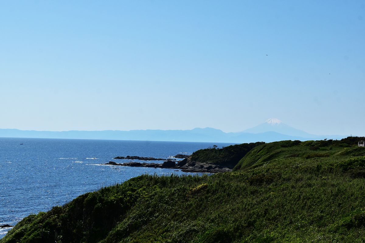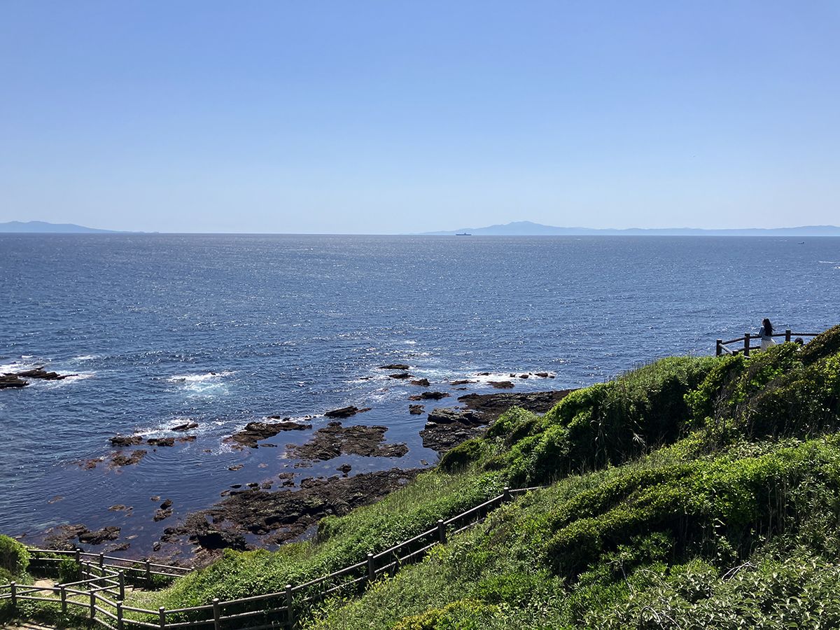 さらに奥へ進むと、伊豆大島まではっきりと見える日もあるという絶景ポイント。一面「海・海・海」という場所です。磯へ下りる階段もあります。