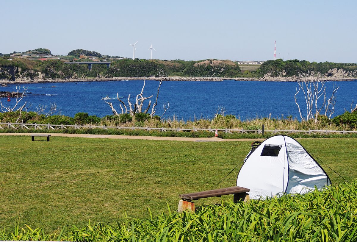公園最初の絶景ポイントは「うみのね広場」。ここにはキレイな芝生が敷かれ、座ったり寝転んだりできます。この日はテントを張っている人もいました。遠方に宮川公園の風力発電設備などが見える開放的な空間です。第二展望休憩所もあります。