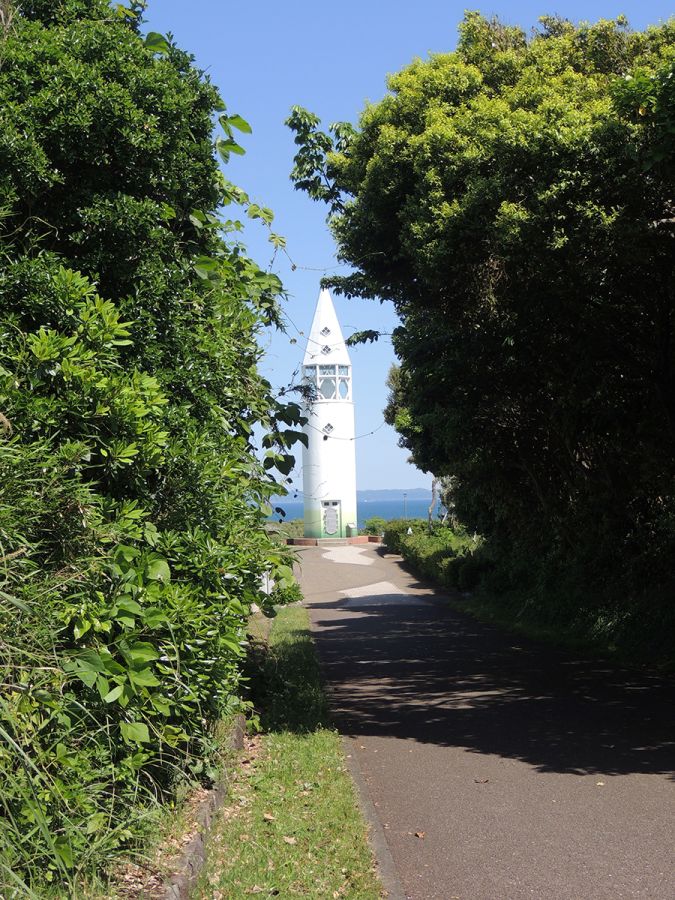 さらに進むと、細い道と緑の向こうに灯台が見えて来ました。