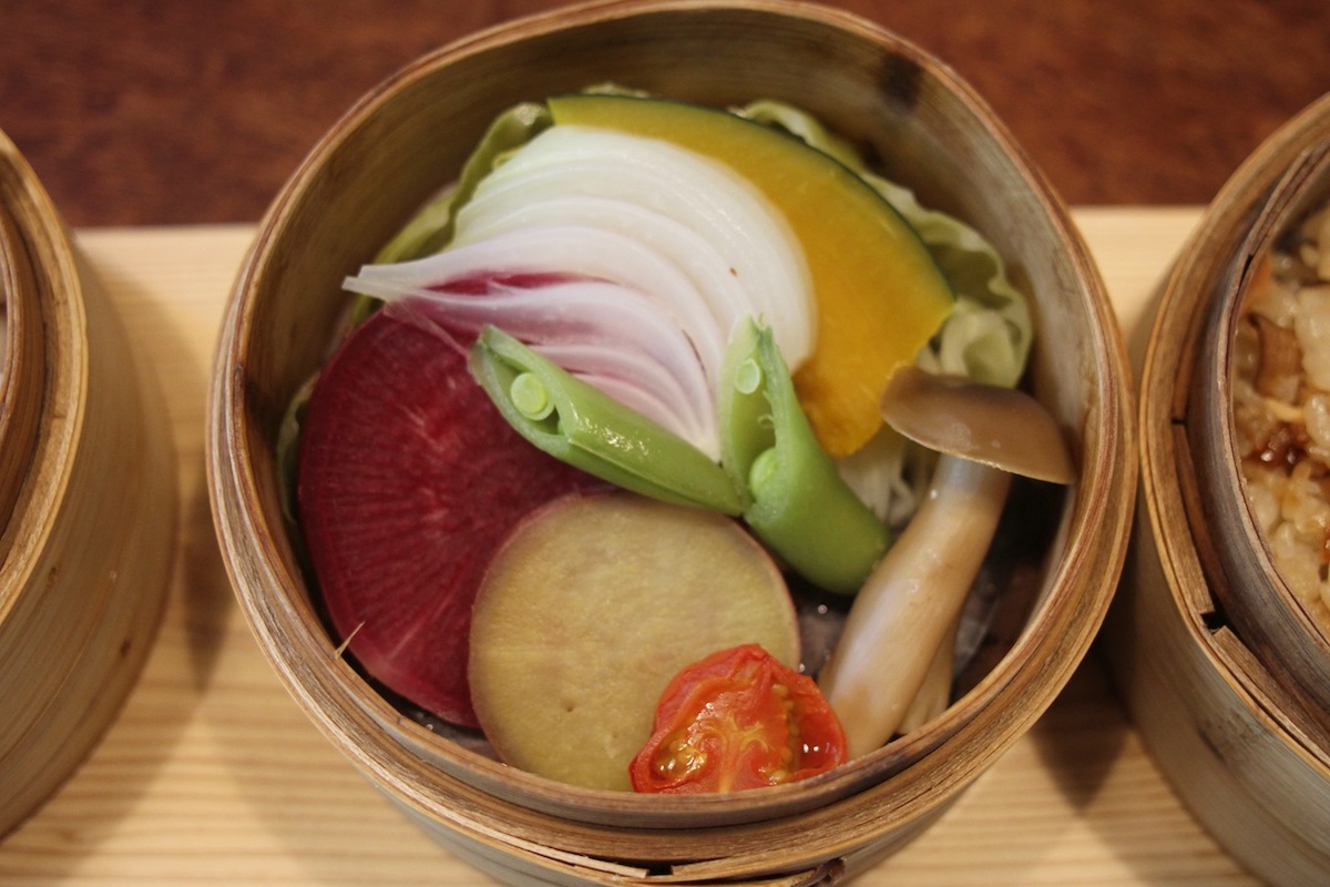 「ふじ寅」でいただけるランチメニューは「季節野菜のせいろごはん」2750円の一つのみ。3つのせいろに、ほかほかのお肉や野菜、炊き込みご飯が並ぶビジュアルも抜群! 京都産や旬の食材をふんだんに使用し、ヘルシーでほっこり心温まる料理が堪能できます。