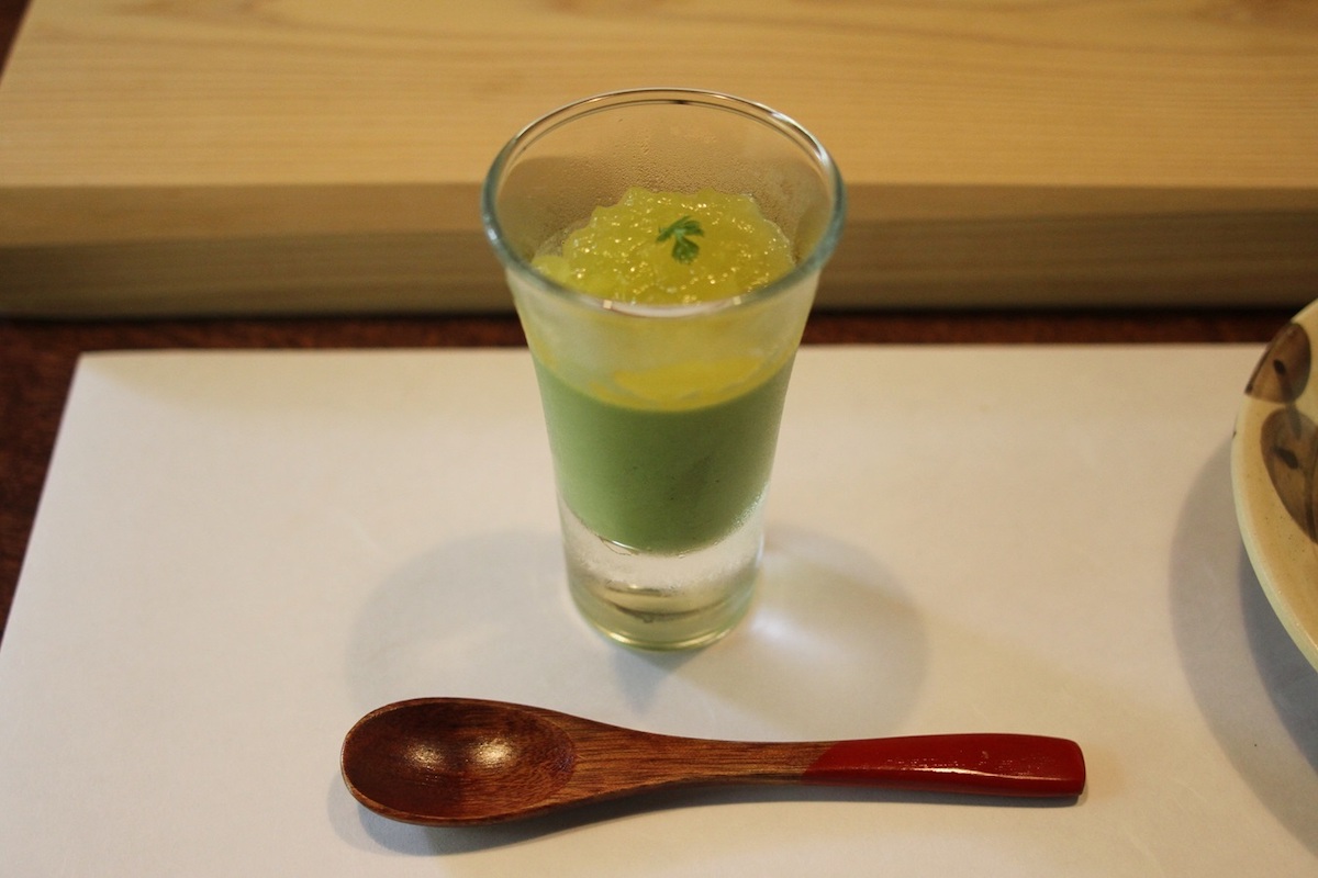 お待ちかねのデザートは、甘夏のジュレがトッピングされている「抹茶のパンナコッタ」。ひと口食べると濃厚な抹茶の味わいと、甘夏の甘酸っぱさが混じり合って、あと味がとってもさわやか! 食後のデザートにぴったりのひと品です。