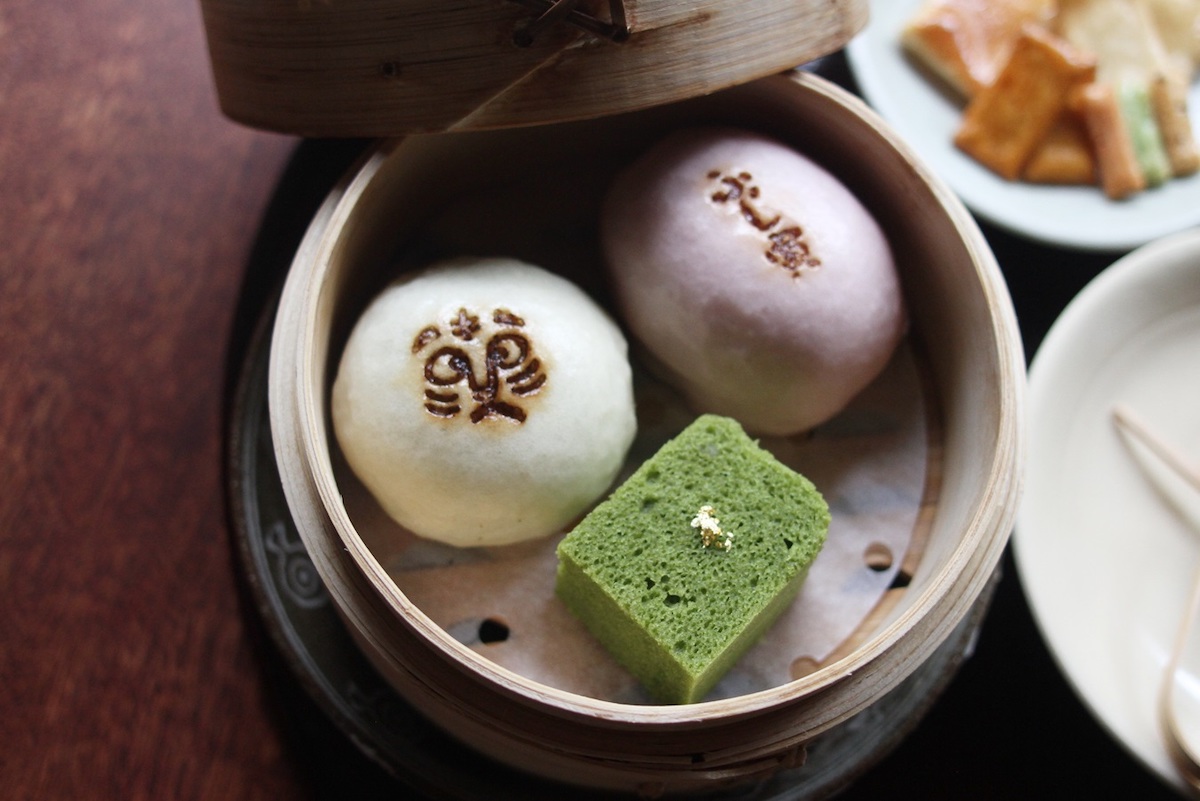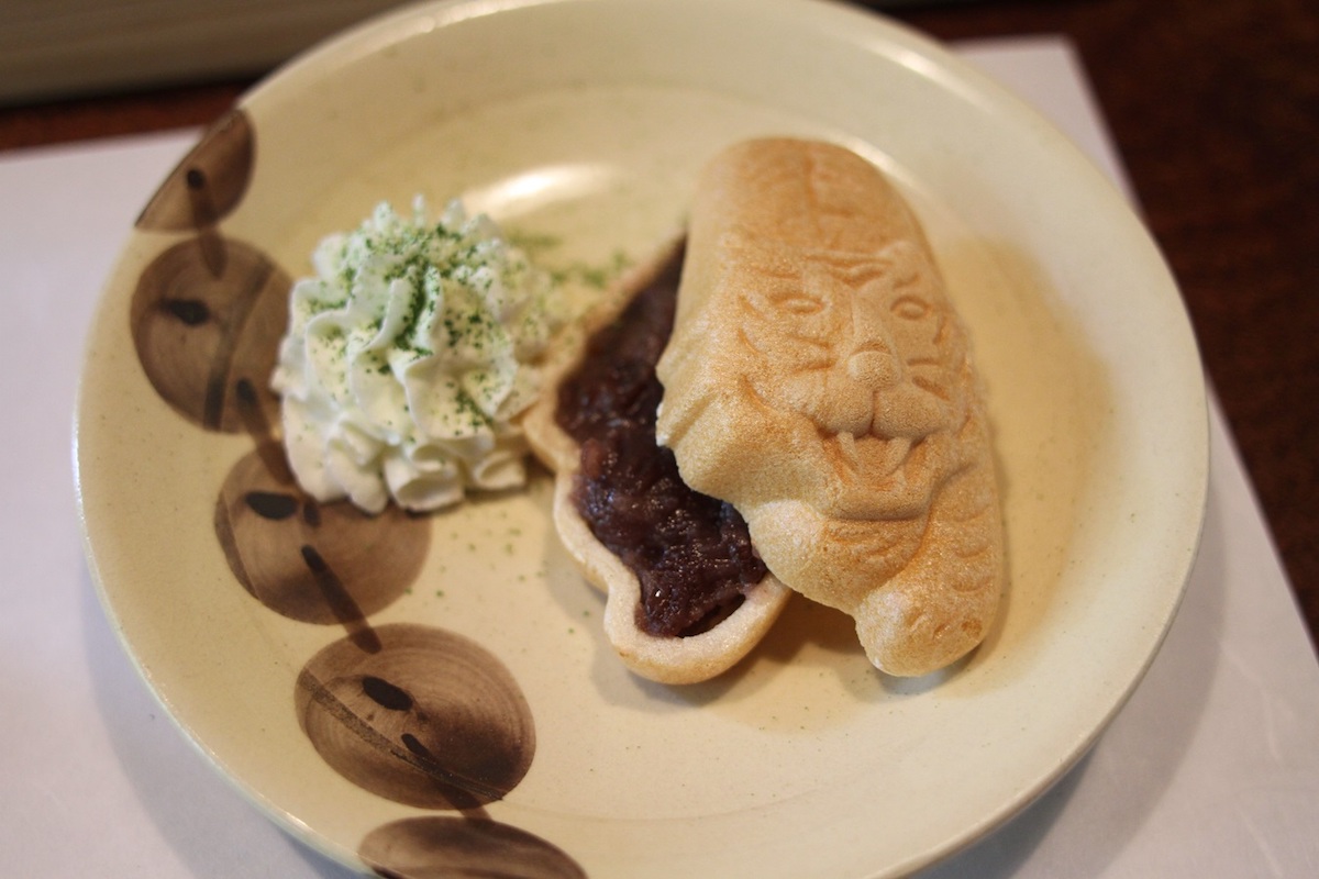 2つの蒸しまんじゅうは、京都・修学院にある京菓子「游月」が「ふじ寅」のためだけに作ったもの。虎が刻印されたまんじゅうには、こし餡が、「ふじ寅」と刻印されたまんじゅうには、いも餡が入っています。蒸したて、ほかほかのまんじゅうに、心もほっこり。自家製抹茶を使った白餡入りの和風ケーキ「浮島」も、ほんのりと香る抹茶のやさしい味に癒やされます。