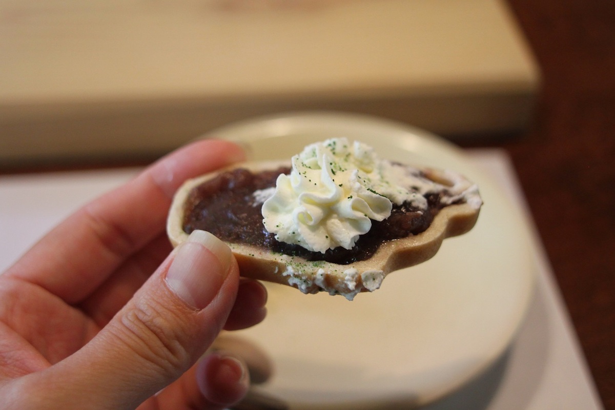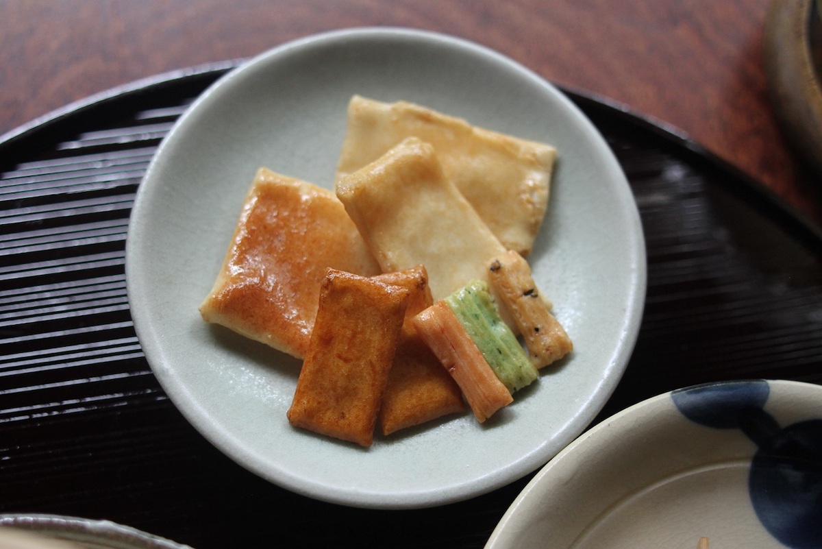 こちらのセットには二条城南にある「東坂あられ」の4種のあられがついています。甘いものの合間に、塩気のあるあられをいただくと、ちょうどいい塩梅。お茶と一緒に、ゆっくりと堪能しましょう。