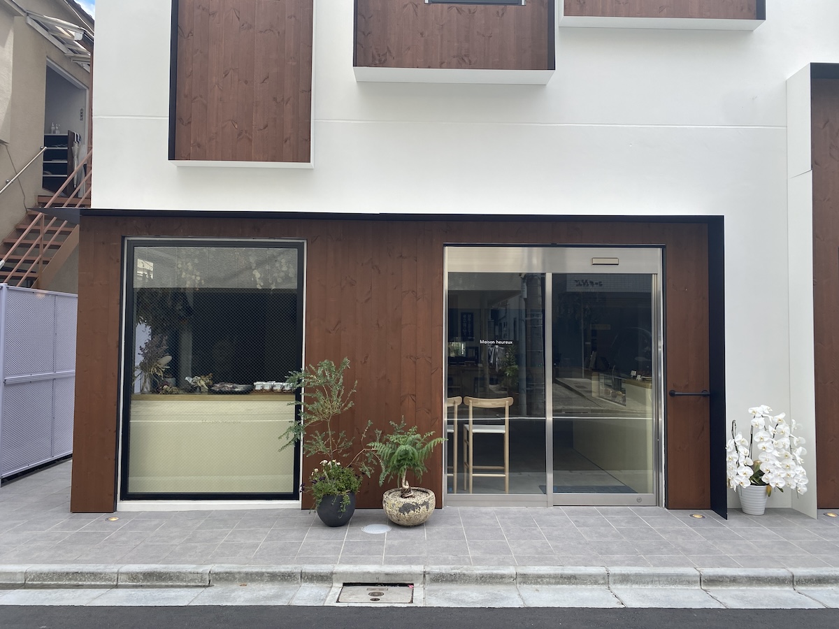東京メトロ清澄白河駅B2出口から徒歩1分。大通りから1本入ると見えてくる、ホワイトとブラウンのカラーリングがおしゃれな建物が、今回紹介する「Maison heureux」です。もともと銀座の有名店に勤めていたパティシエ達がオープンした、パフェと焼き菓子のお店です。