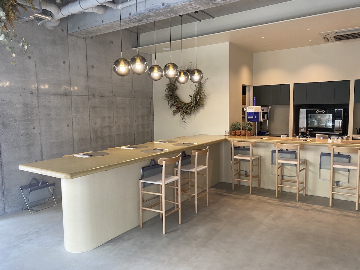 店内はコンクリートとホワイトの無機質さにくわえて、壁や天井にドライフラワーを飾った華やかな空間。全席カウンター席となっていて、計10席です。うち4席の厨房が目の前にある座席は予約専用で、パティシエの話を聞きながら、オーダーしたパフェが作られていく様子を見ることできます。