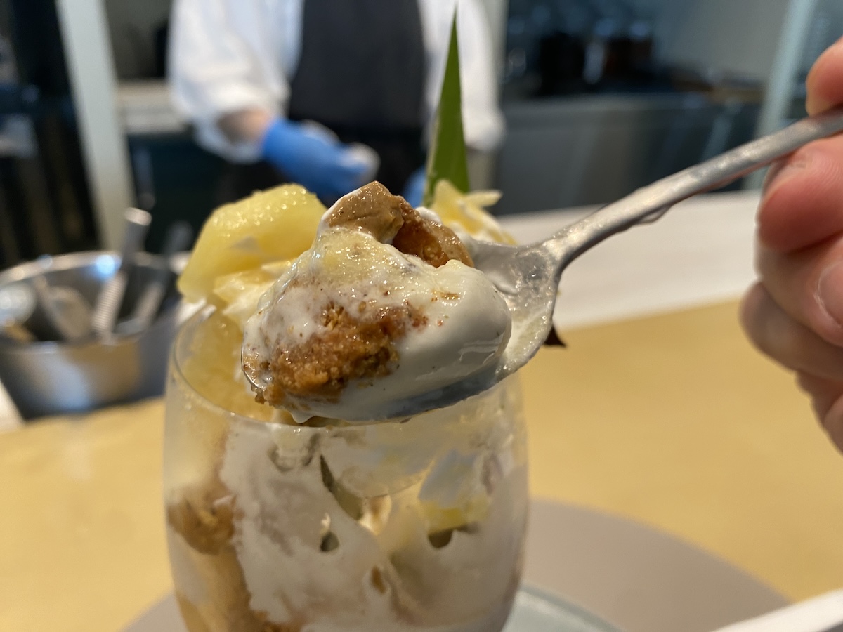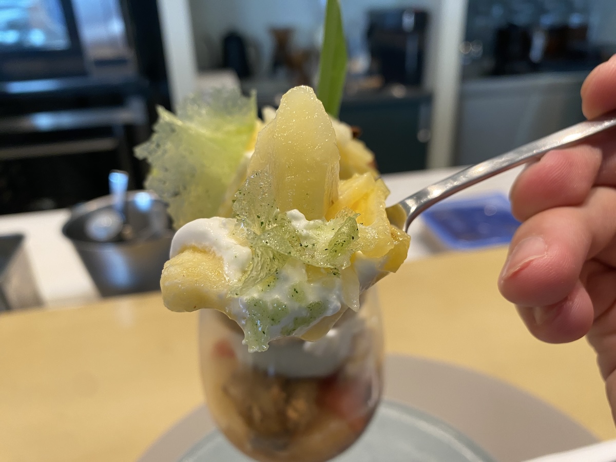 トップを軽く崩してひと口食べてみると、まずグレープフルーツとパインの香りが口いっぱいに広がり、噛めば噛むほどみずみずしい果実の甘みと酸味が出てくるんです。また紅茶のクリームブリュレやココナッツジェラートなど、フルーツとは異なる甘みもあるため、甘さに奥行きが生まれているのもグッド!そこにコリアンダーのチュイルのサクサクとした食感と独特な香りがアクセントになっているので、クセになります。