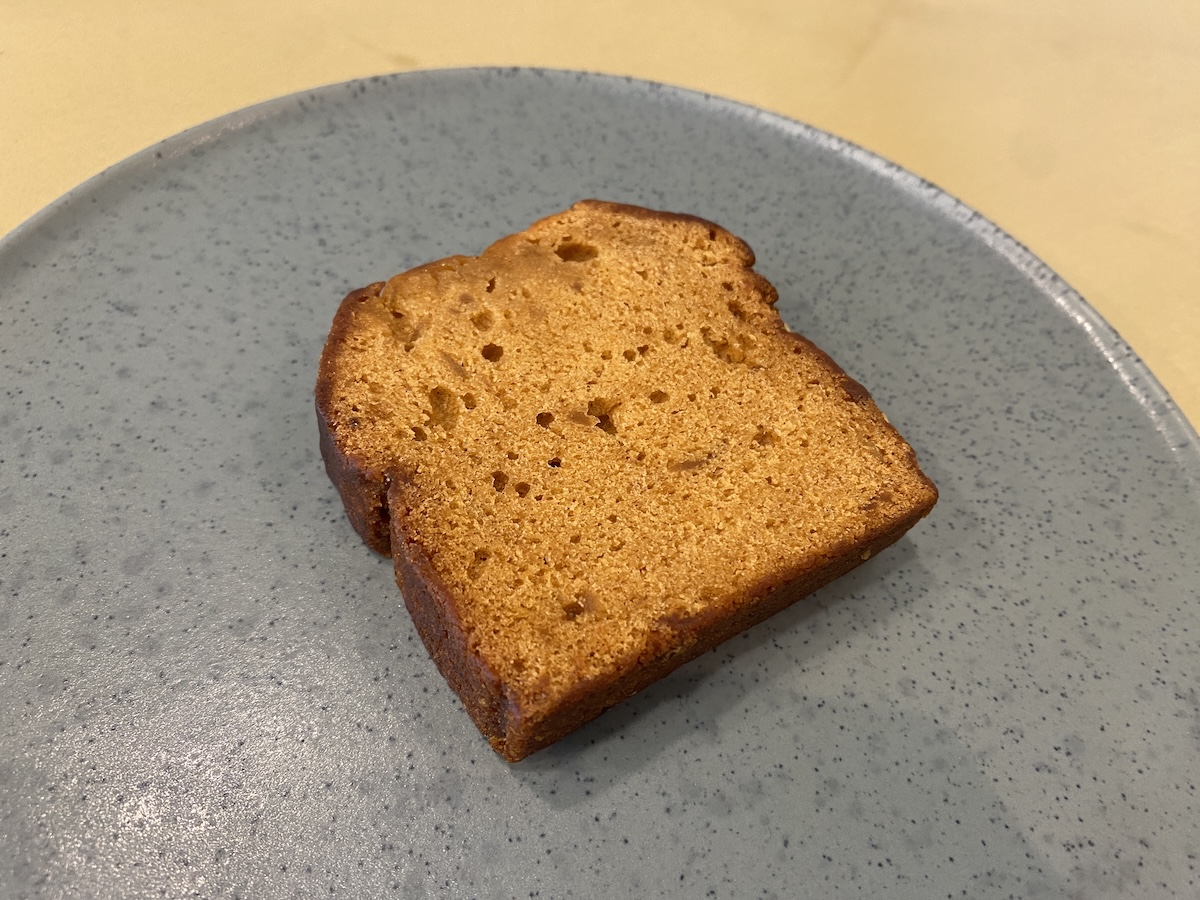 「キャラメルジンジャーオレンジ」は、ジンジャーの心地いい香りが感じられるパウンドケーキ。生地はしっとりと口当たりがよく、ほのかに苦さを感じるキャラメル味です。さらにオレンジスライスが練り込まれているので、フルーティーな酸味が時々広がり、なんともクセになる味わいに仕上がっています。