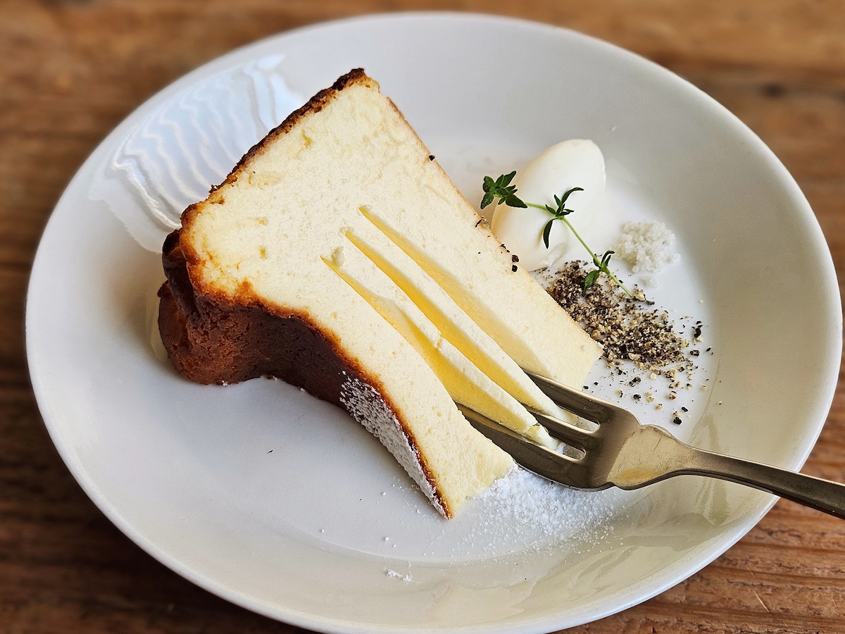 フォークを軽くあてるだけで、すーっと中に入っていくほどなめらかな「バスク風チーズケーキ」。