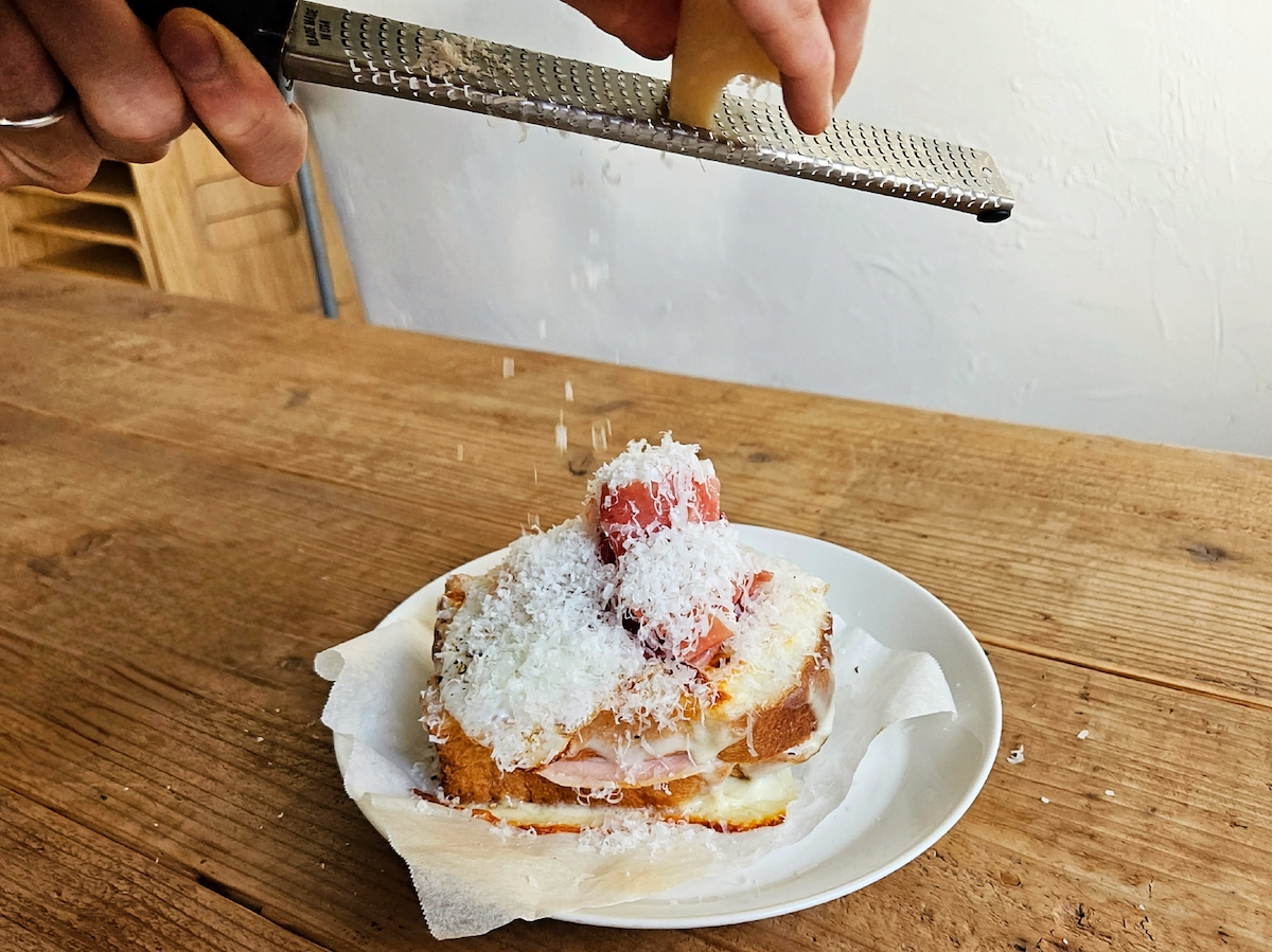 さらに、パンは「ブーランジェリー ヤマシタ」のふわふわ山食パン、その間にはさまれたハムは「千駄木 腰塚」のベリーハムと、すべての素材がぜいたくすぎる。今思い出しただけでまた食べたくなる大満足のクロックマダムです。