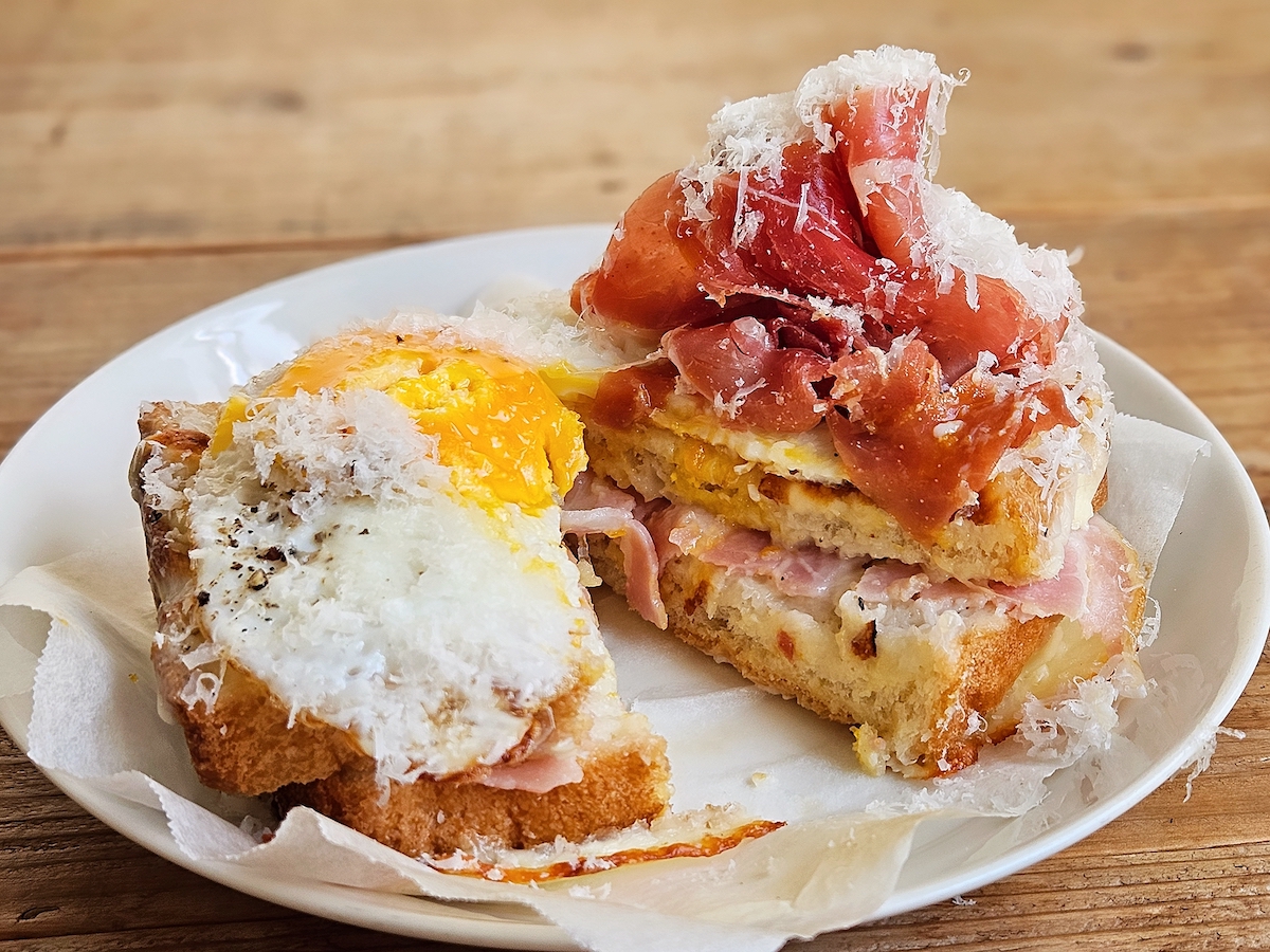 半熟の目玉焼、香ばしい焼き目のチーズ、ベシャメルソースがのるパンの上には、山盛りの生ハム。