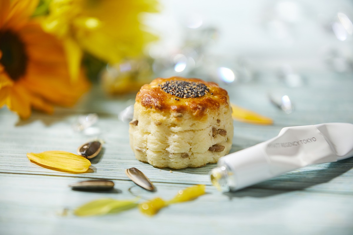 外はサクッと中はふんわりと焼き上げられた、ヒマワリをかたどった「ひまわりスコーン」。生地には、健康や美容にも効果があるといわれるヒマワリの種が練り込まれています。 絵の具チューブに入ったホテルメイドのオレンジジャムとマスカルポーネもアーティスティック。まるで画家になった気分で楽しめます。