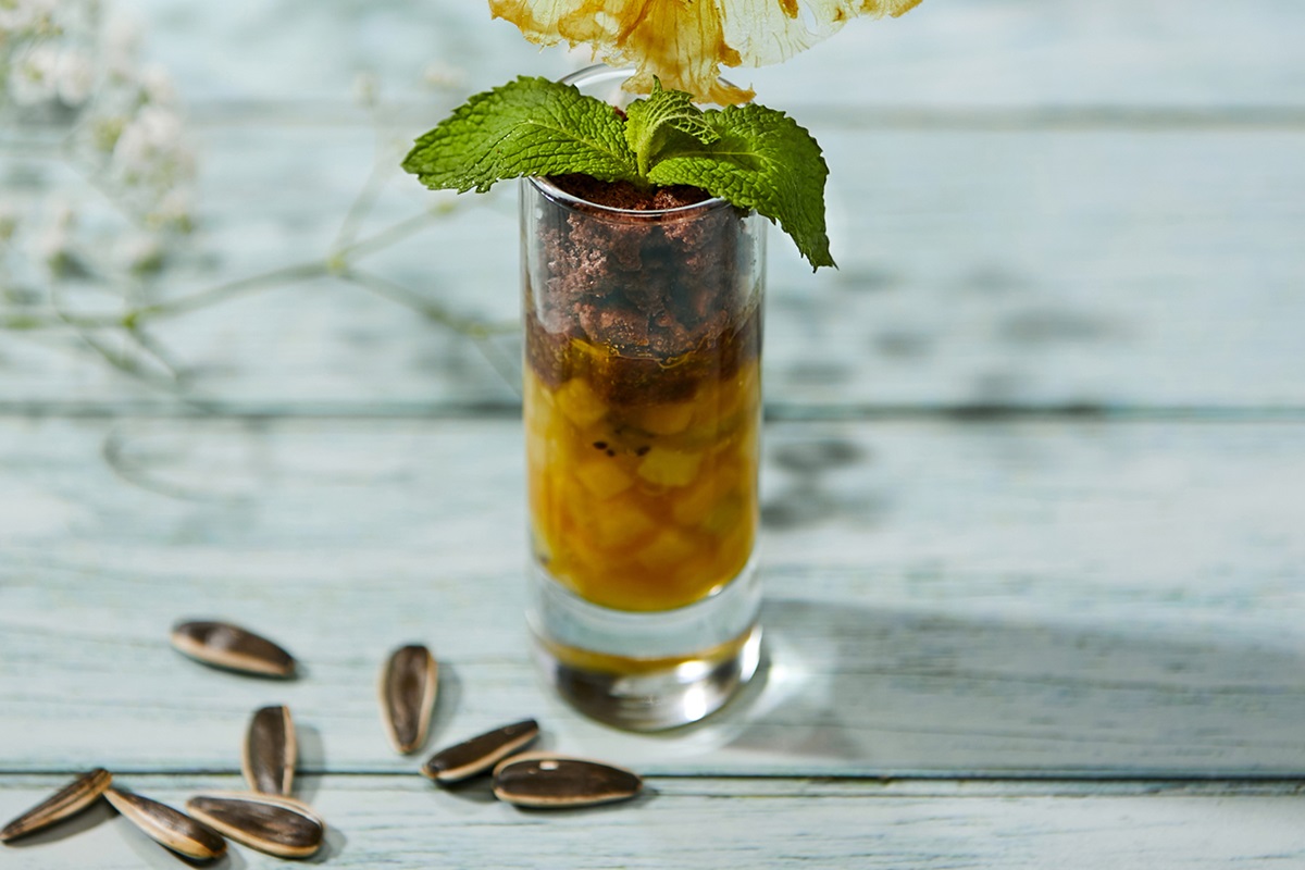 薄くスライスしたパイナップルを低温オーブンで長時間乾燥させ、夏の太陽に向かって咲くヒマワリに見立てています。中央のロリポップの中には口当たりなめらかな紅茶風味のミルクチョコレートムースとフルーティーなアプリコットジュレがたっぷり詰まっていて、パリッとひと口食べた瞬間に中からとろけだします。