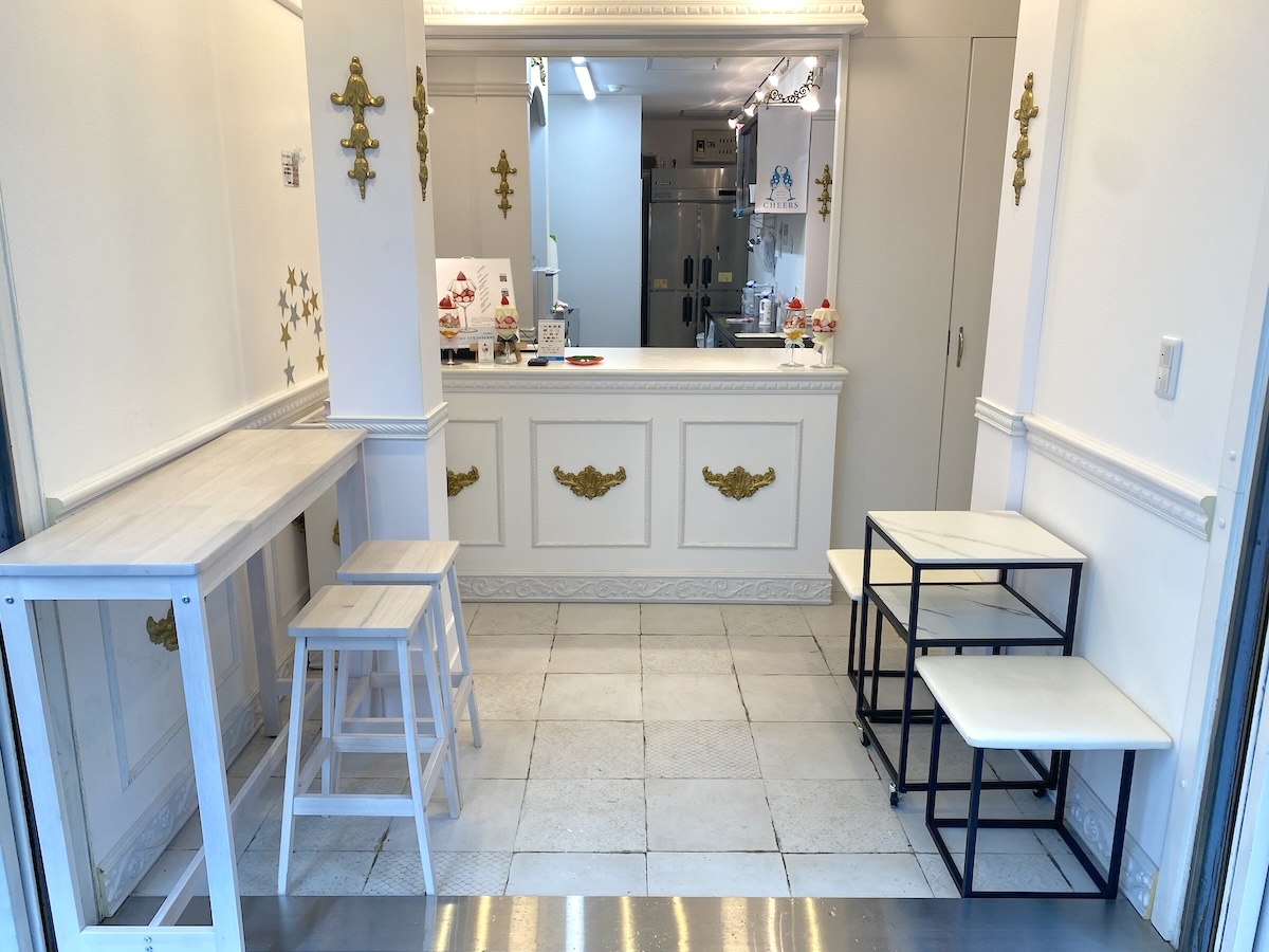「CHEERS 竹下通り店」は、ワイングラスパフェ専門店。持ち歩けるパフェを提供しているため、店内はコンパクトなサイズ感です。白を基調にゴールドの装飾が施された、エレガントな雰囲気になっています。