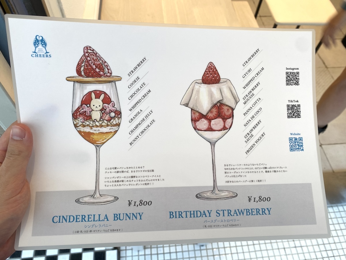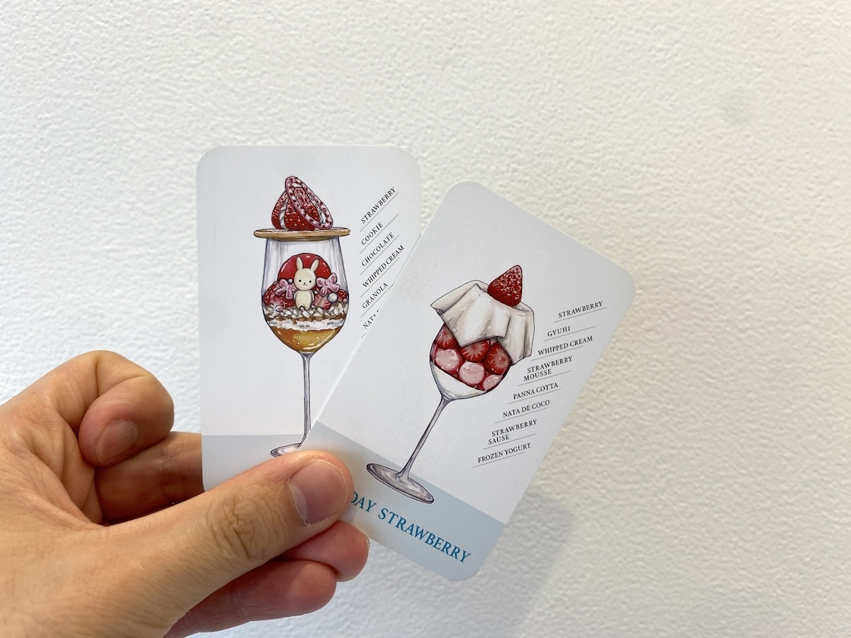 「CHEERS 竹下通り店」ではパフェをオーダーすると、イラストとトッピングが書かれたパフェカードがもらえます。今後はイチゴ以外のフルーツを使ったパフェも展開していくようなので、集めてみてくださいね。