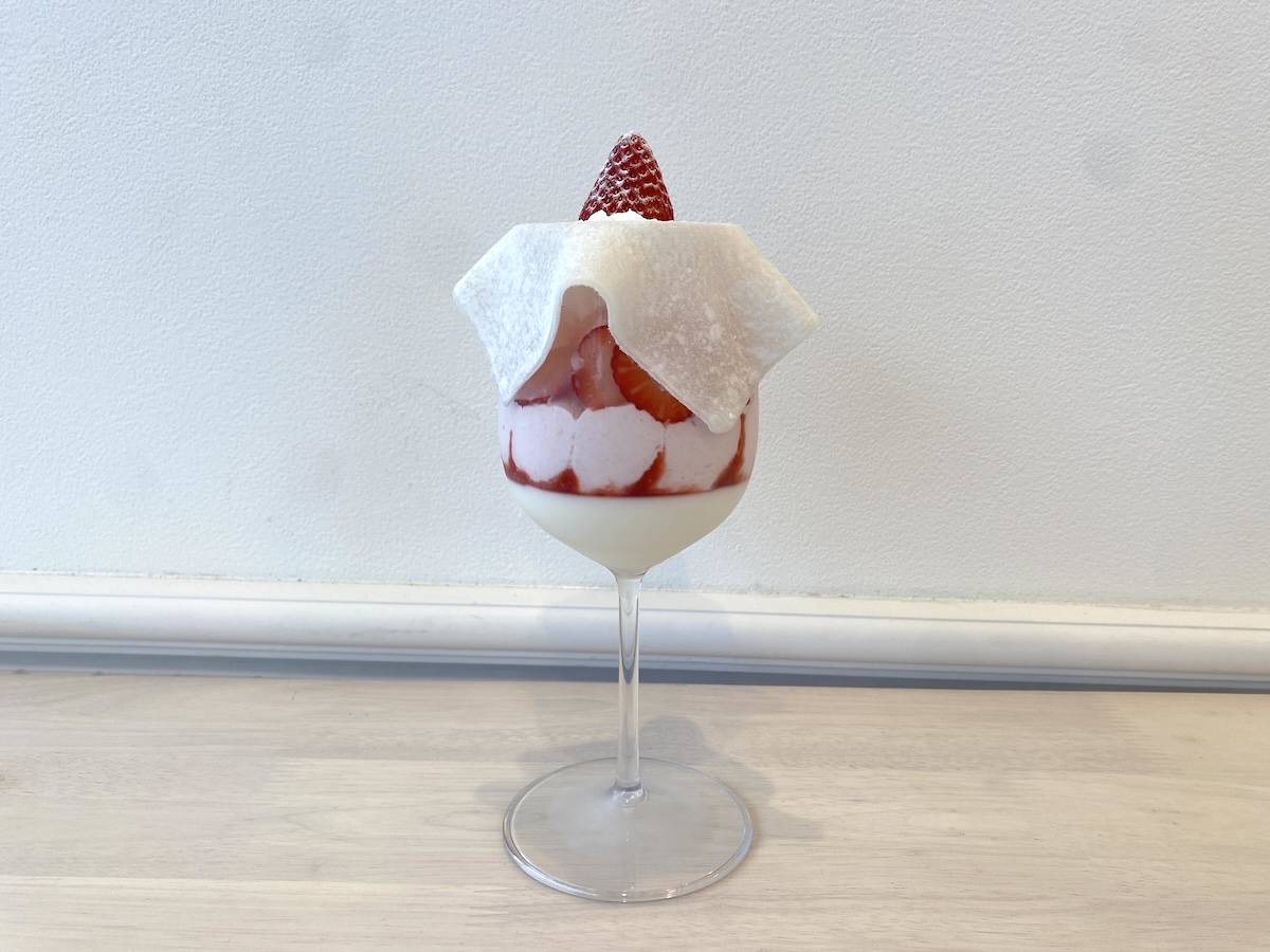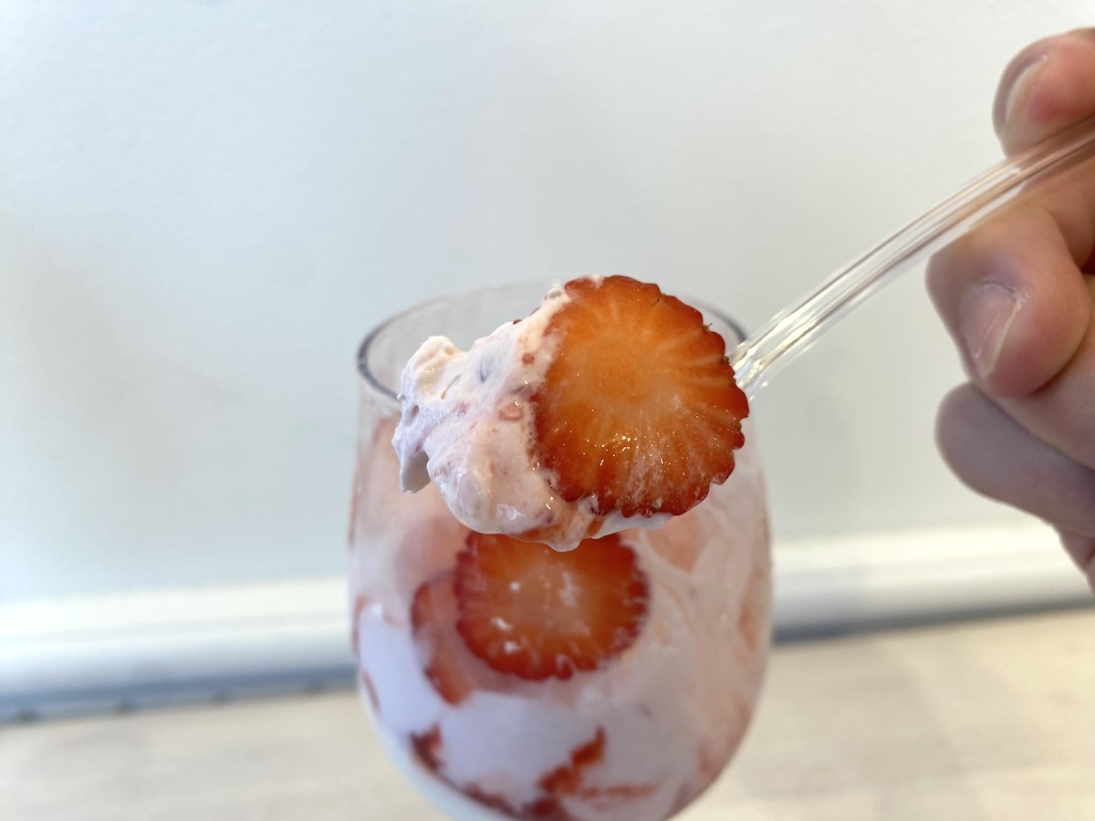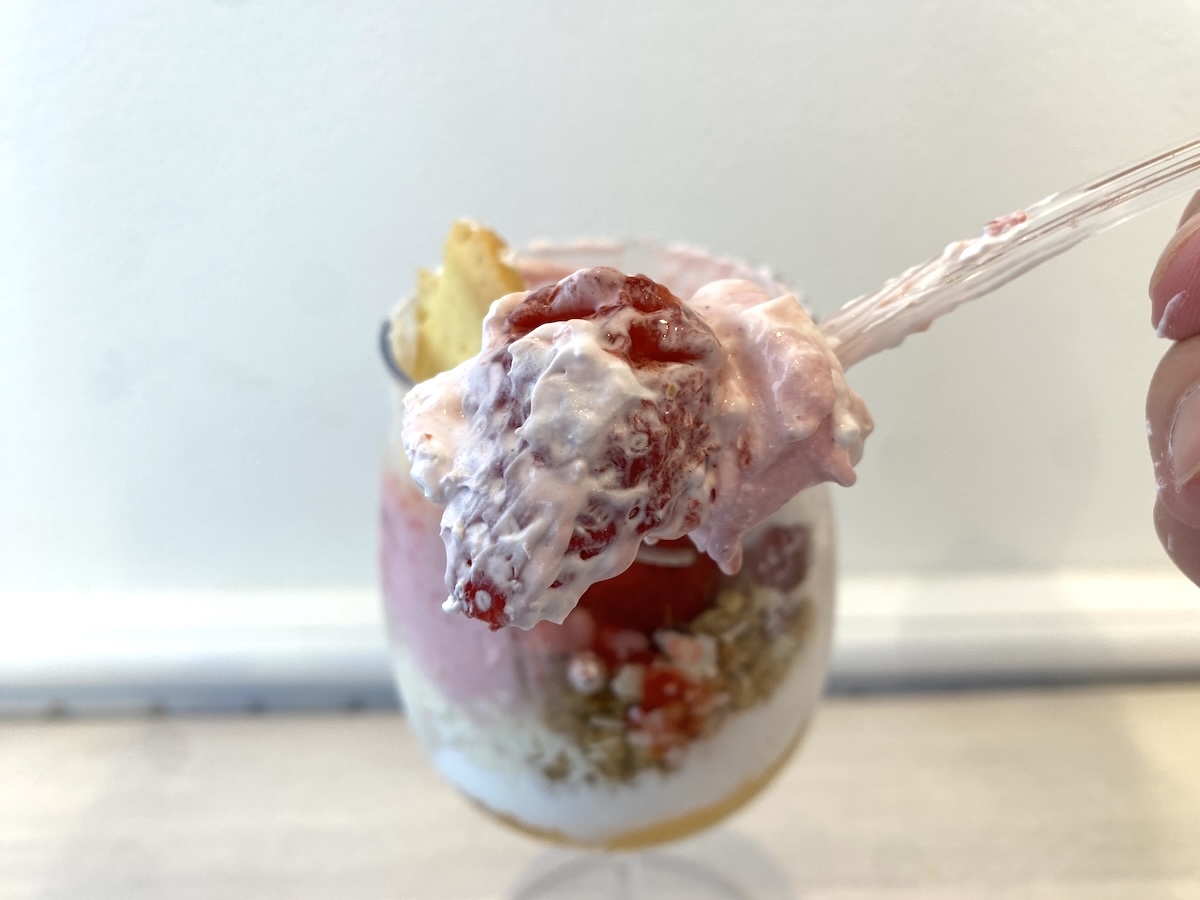 食べ進めていくと、ヨーグルトアイスが見えてきて、ほどよく甘酸っぱいイチゴにさっぱりとした味わいが加わります。ナタデココの独特な食感がアクセントになっていて、最後まで飽きずに食べられるボリューム満点のパフェです。