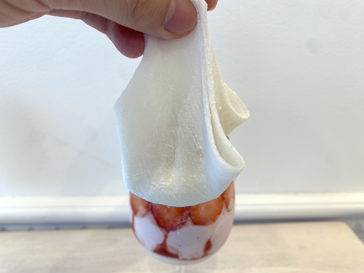 上の部分を少し食べてからクッキーを割り、グラスのなかの具材と合わせて食べるのがおすすめ。甘酸っぱいストロベリーアイスや食感のいいグラノーラなどの具材を、一番下にある心地いい香りのノンアルコールシャンパンゼリーに絡めて食べると、さっぱりとした上品な味わいを感じられます。