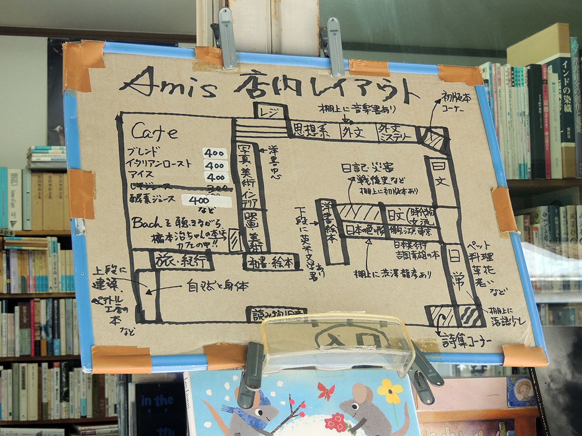 カフェスペースは店を入って左側の奥。店内レイアウト図の左のほうです。店主さんと奥様の手作りコーヒーやジュースが楽しめます。上の写真のテーブル手前に置いてある2冊の本は、店名「AMIS」の由来となった本。タイトルに「AMIS」と入っています。