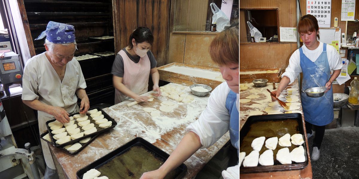 ポテチパン製造工程の一部を見せてもらいました。まずはパン生地をのばし、そこに特製ソースをぬり、ポテチやキャベツなどをはさめる形に整えます。
