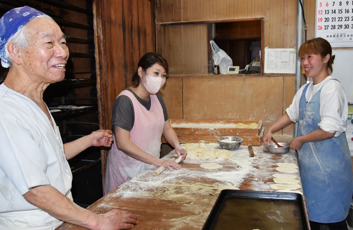 写真左の2代目を中心に、中井さんご家族で営んでいるお店。昭和16年(1941)に和菓子店として開業し、昭和28年(1953)からパン屋さんとなりました。「お客様の笑顔が見たいから」という2代目の思いのもと、朝の7時から夜9時まで営業しています。