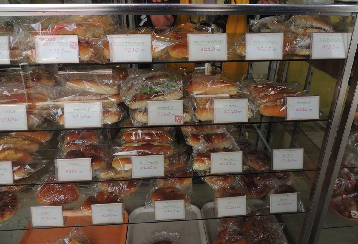 ビニール袋で包装されたパンが店頭に並んでいます。「小倉あんぱん」や「クリームパン」は各160円、「たまごサンド」や「ハムカツサンド」は各210円。価格帯は160円くらいから200円強のものがほとんどです。