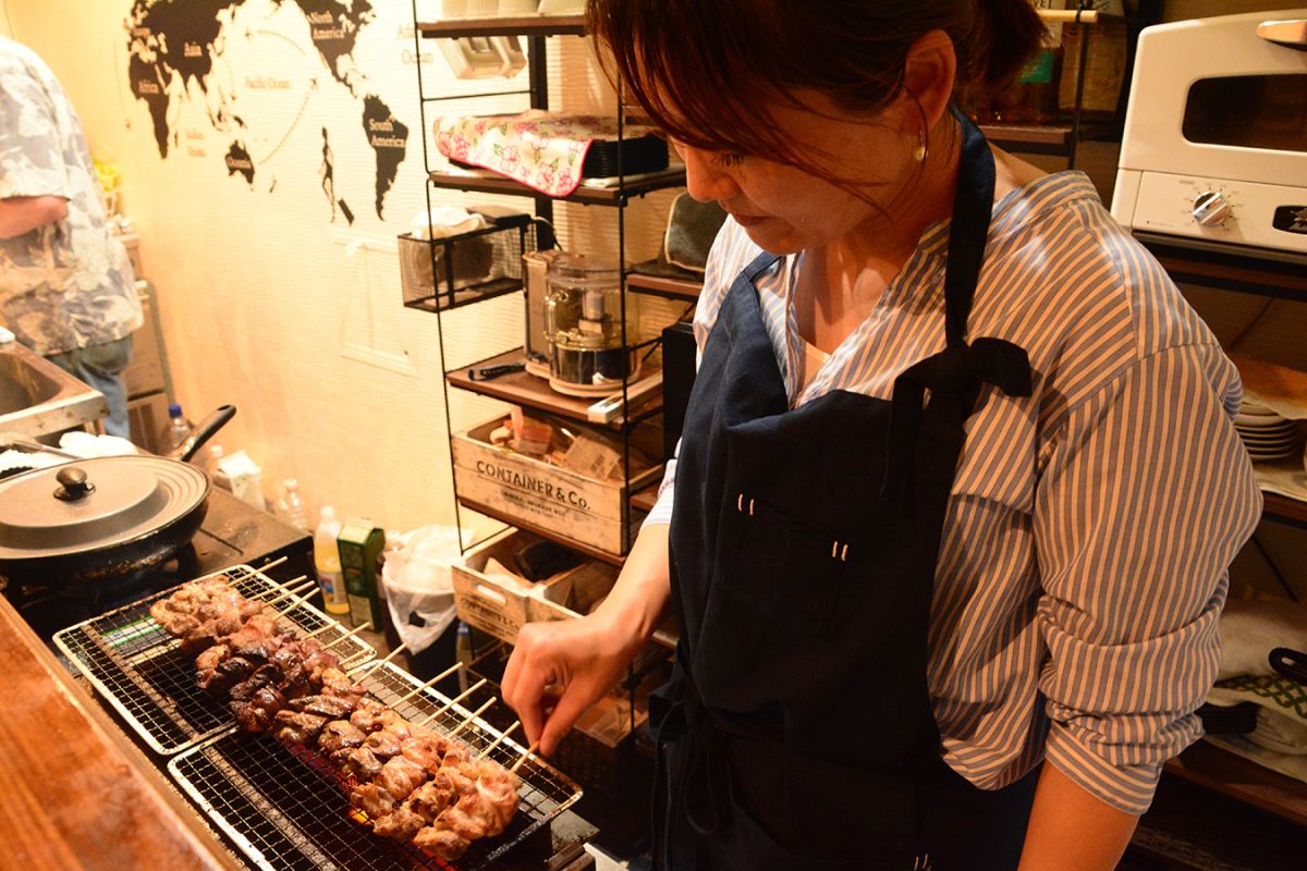 信玄どりなどを使った串焼きも人気の一品。種類は日によって変わりますが、どれも味は絶品。「岩手カモ生ハム」690円を美しく盛り付ける彼女が串焼きを焼いてくれました