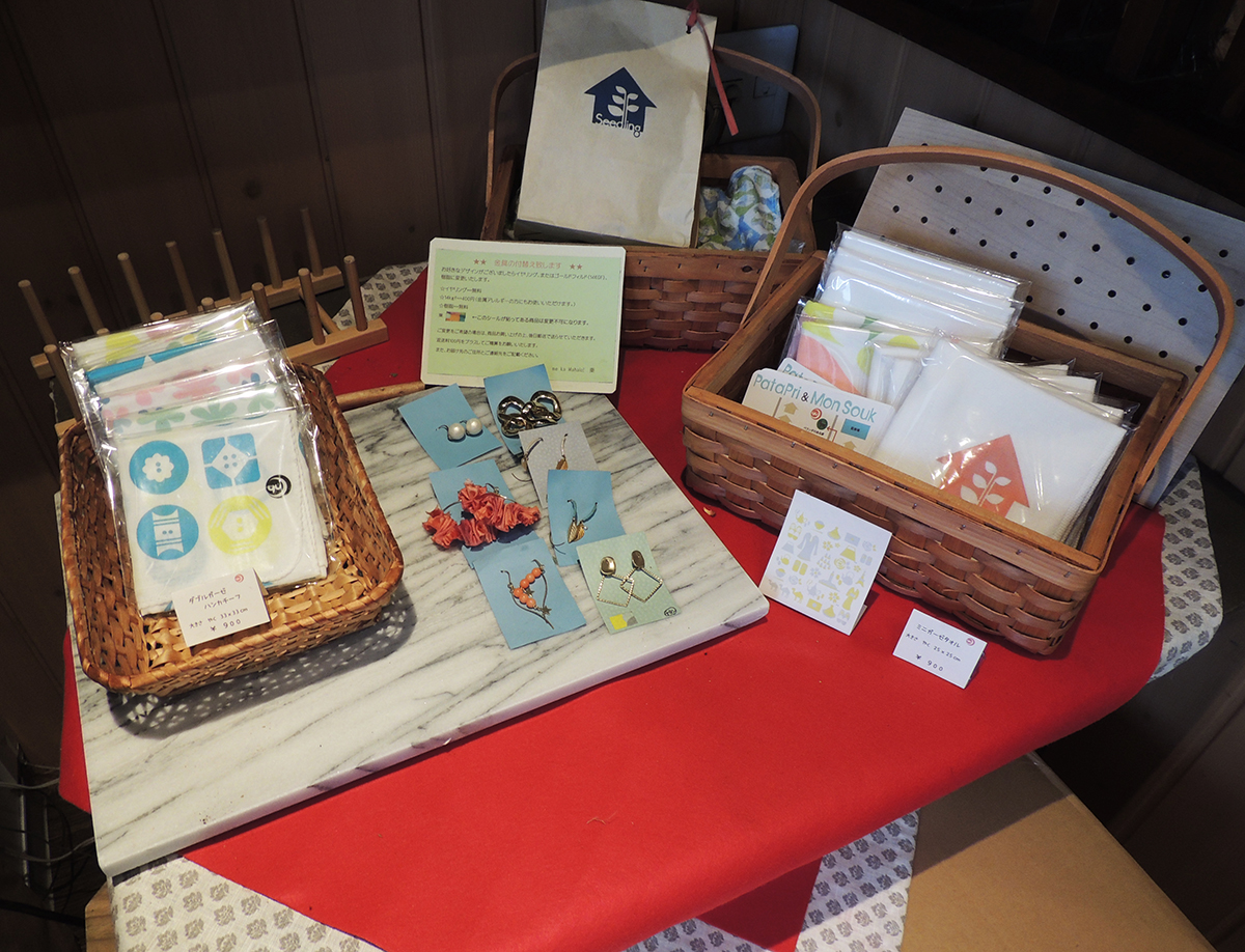 お店の出入り口近くでは、かわいいグッズも販売していました。写真上あたりに見える「シードリングキッチン逗子」のロゴをデザインした方のグッズです。「ロゴ入りミニガーゼタオル」900円など。