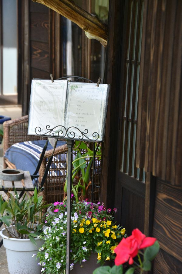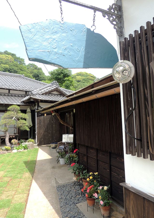 手作りの看板の奥にお店があります。さらに奥にあるのは伊東シェフの実家。江戸時代中期の建築で築240年以上。趣があります。