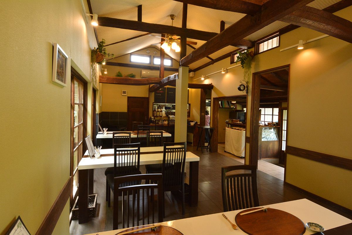お店の入り口あたり。花や和風の椅子など、風情があって落ち着く空間です。中に入ると店内は天井が高く、テーブル席は3つ。開放的で特別な時間を過ごせる場所です。