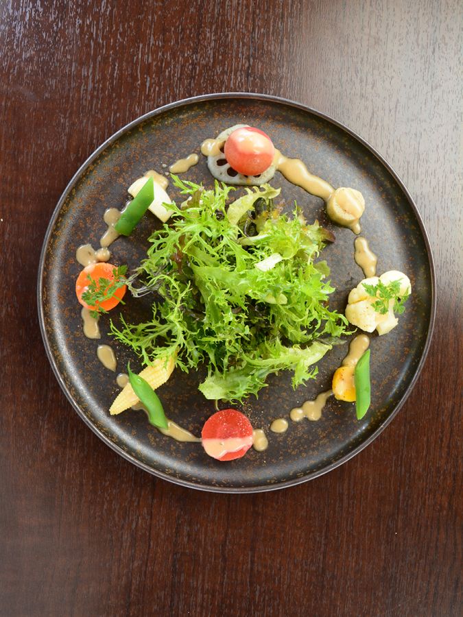 こちらがコース内の鎌倉野菜のサラダ仕立て。トマト、カリフラワー、ゴボウ、ニンジンなどを美しく盛り付け。