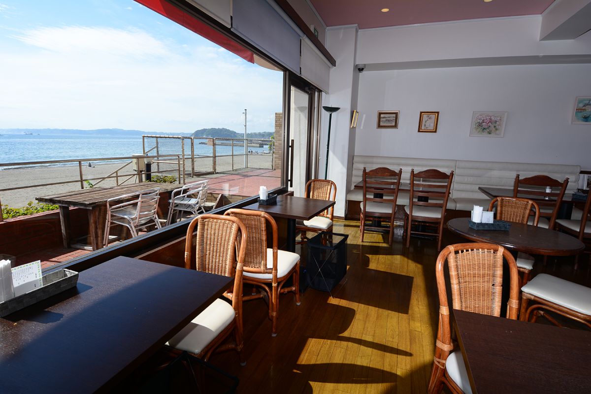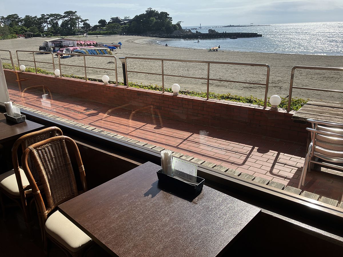 大きな窓からは森戸海岸、森戸大明神、そして遠くの海上に赤い鳥居が見えます。天気がいい日には富士山もくっきりと見える最高のロケーション。約40年前、この景色を見て、この場所に出店を決めたとか。フランス料理店で「ランチコース」3993円なども人気です。