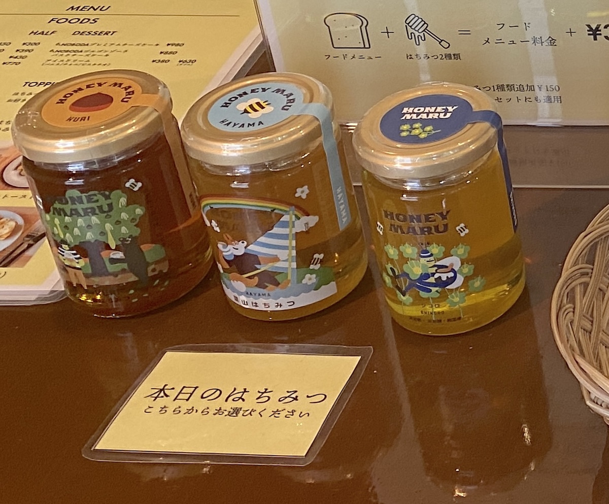 トーストやチーズケーキなどカフェメニューは23種類と豊富。フードメニューの一部は、オーダー時にトッピングするハチミツを日替わりの3種類のなかから1つ選びます。