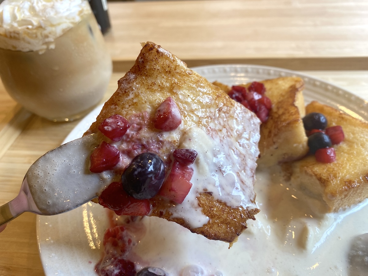 4cmと厚切りのフレンチトーストなので、ミルクや卵がたっぷり染み込んでいます。中のふんわりとしたやわらかさと、外のかたさとの食感の差がとても心地いいです。2種類のベリーとバニラアイスを合わせて食べると、酸味と甘みがグッと強まりつつバランスがとれた味わいに。最後まで飽きずに食べられちゃいます。