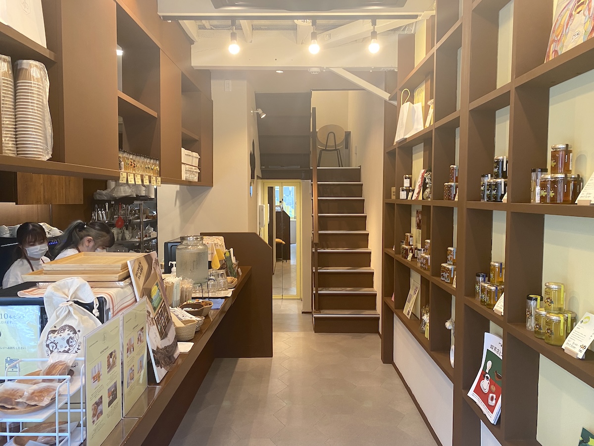 入り口のある1階は、注文を行うカウンターとハチミツを購入できる物販を兼ねたフロアです。ハチミツは10種類展開していて、それぞれビンタイプ(160g)とスティックタイプ(2.5g×25本)があります。スティックタイプは個包装されているので手を汚すことなく使えて、友人などにおすそ分けもしやすいので人気だそう。