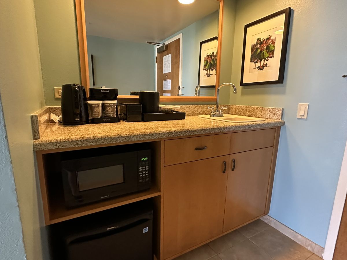 また、各客室には、ウェットバーがあり、電子レンジ、冷蔵庫、シンク、湯沸かしポット、コーヒーメーカーなどが備わっていて、簡単な食事を自分で準備することも可能。部屋に電子レンジがあるので、テイクアウトした食事の温めにも重宝し、円安の今、お財布にうれしい設備ですね。