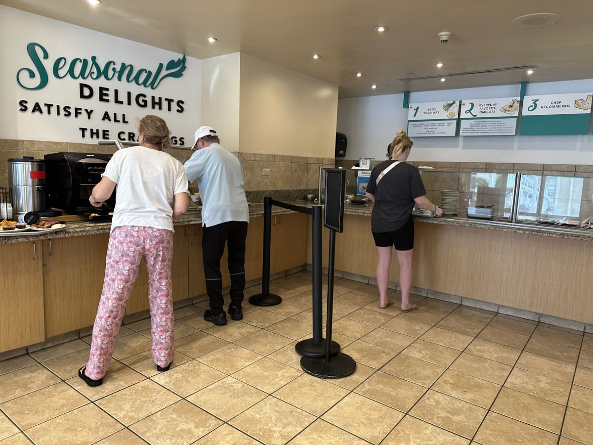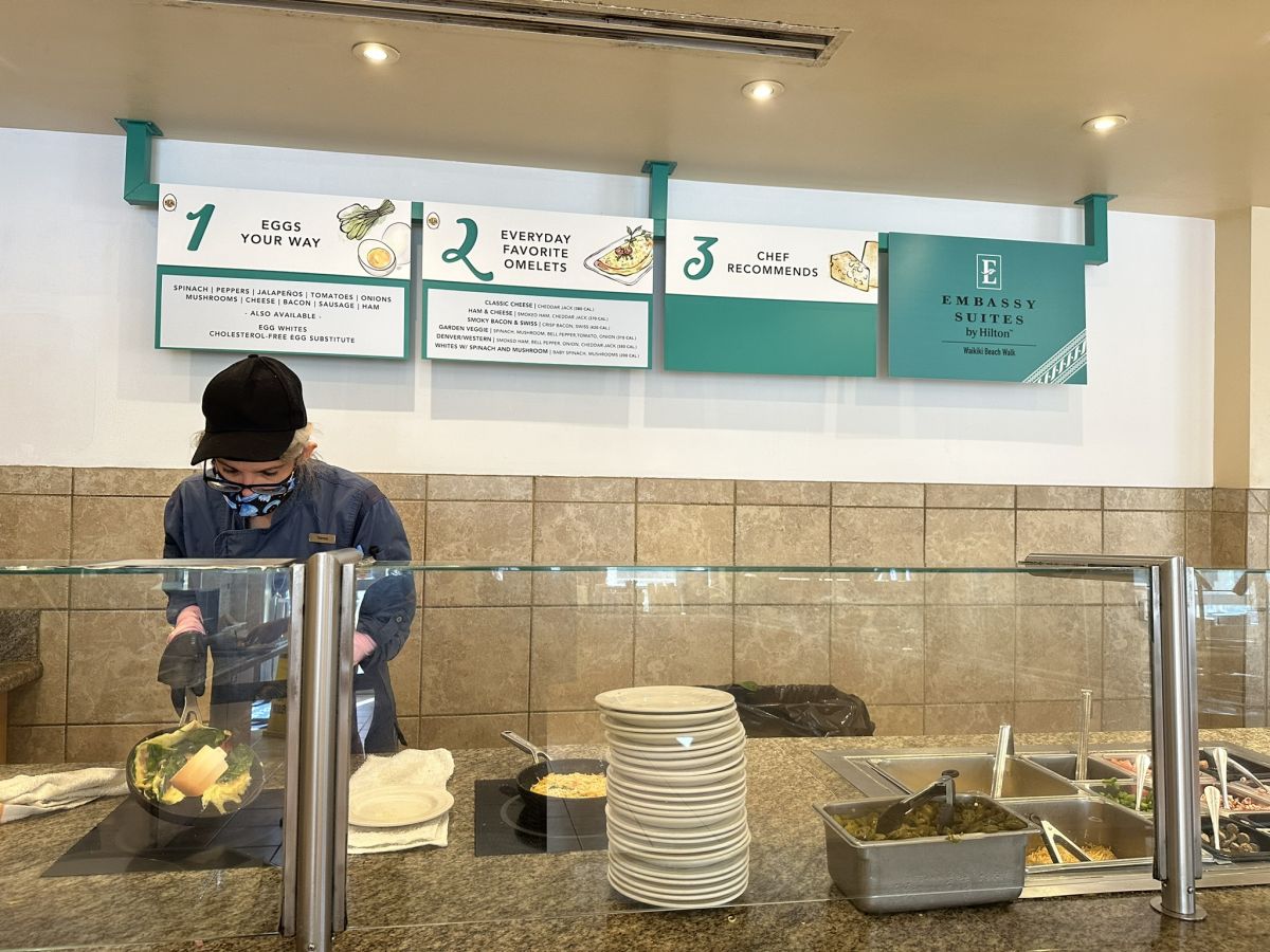 エンバシー・スイーツ・バイ ヒルトン・ワイキキ ビーチウォークは、多くのサービスが充実しています。その1つが、宿泊者なら全員、追加料金なしで利用することができる朝食サービスです。ホテル4階のグランド・ラナイで平日は6時半から9時半、そして週末は~10時半まで提供。