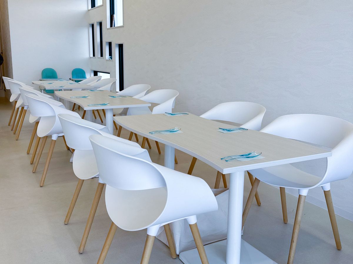 沖縄のきれいな海と砂浜をイメージしたという白×ブルーの店内で、まるでアートのようにフォトジェニックな自家製スイーツや、ロブスターロールなどの本格フレンチが味わえます。