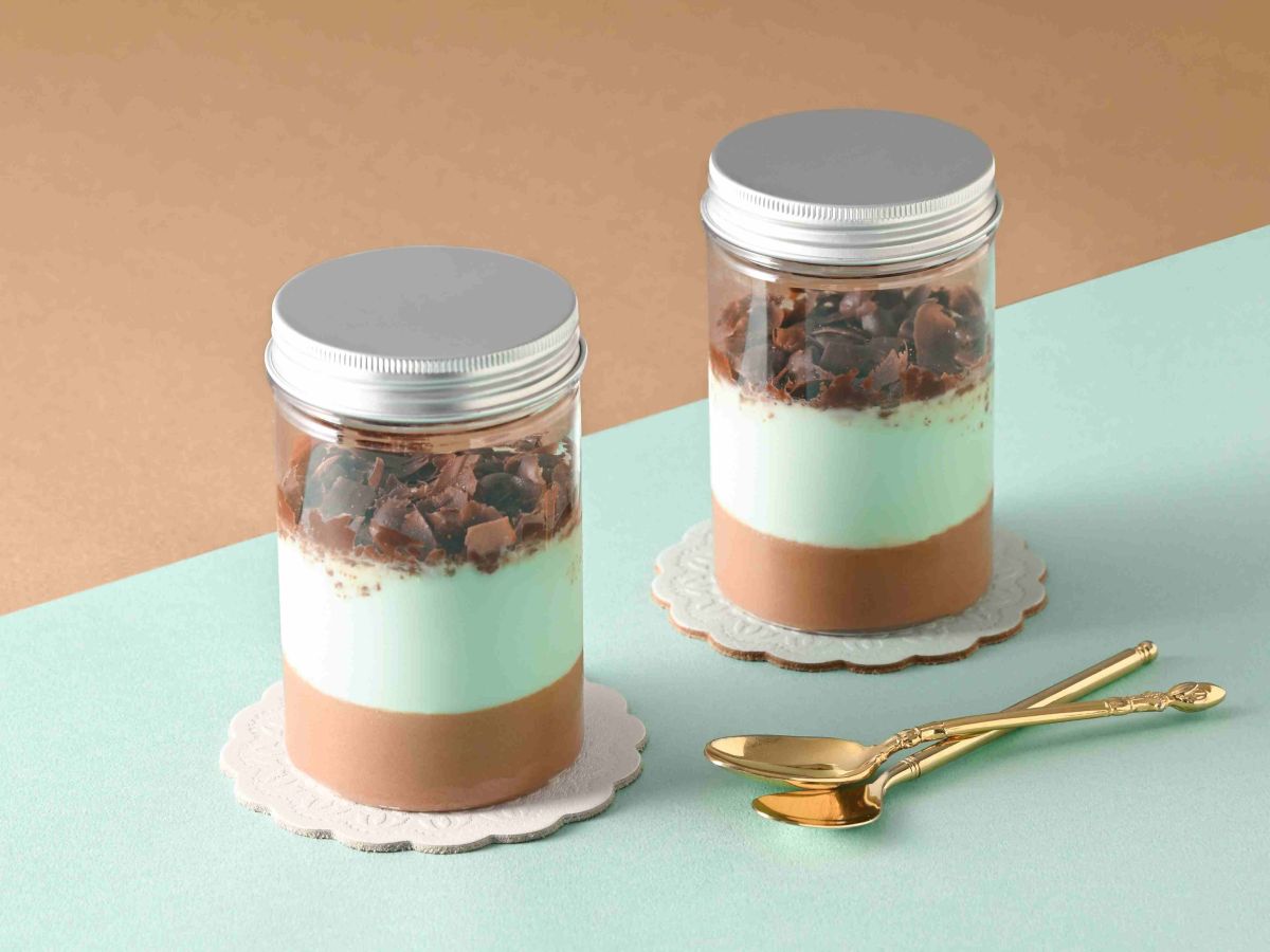 チョコムースの上にミントのブラマンジェを重ね、表面には薄く削った軽い食感のチョコレート(コポー)をたっぷりとのせた瓶詰スイーツ。ミントのブラマンジェと鮮やかなコントラストのコポーを混ぜ合わせて食べることで、いっそうチョコミントの風味を感じられます。