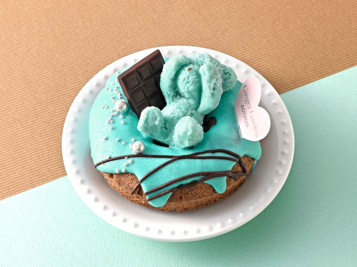 かわいい手作りの「テディベアクランチ」がちょこんと眠っているドーナツケーキ。テディベアのキュートなポーズにも思わず笑みがこぼれます。
